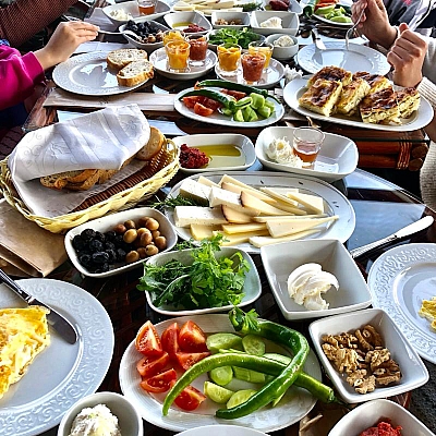 Kış ve ilkbaharda bize özel bir lezzet olan ebegümecili omletimiz de büyük ilgi çekmektedir. Yaz mevsiminde ise ektiğimiz salatalıkları ve yeşil biberleri topladığımız zamanlarda kahvaltıda bostandan taze koparılmış organik sebzeler yine kahvaltımızda sizlerle!